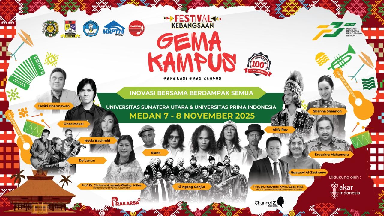 MEDAN – Universitas Sumatera Utara (USU) menjadi tuan rumah penyelenggaraan Festival Kebangsaan “GEMA KAMPUS” di Medan pada 7–8 November 2025. Kegiatan yang diinisiasi bersama Majelis Rektor Perguruan Tinggi Negeri Indonesia (MRPTNI) ini merupakan platform nasional yang mempertemukan akademisi, peneliti, musisi, seniman, mahasiswa, dan generasi muda dalam ekosistem kreatif yang menggabungkan ide, inovasi, karya artistik, riset akademik, serta narasi kebangsaan.