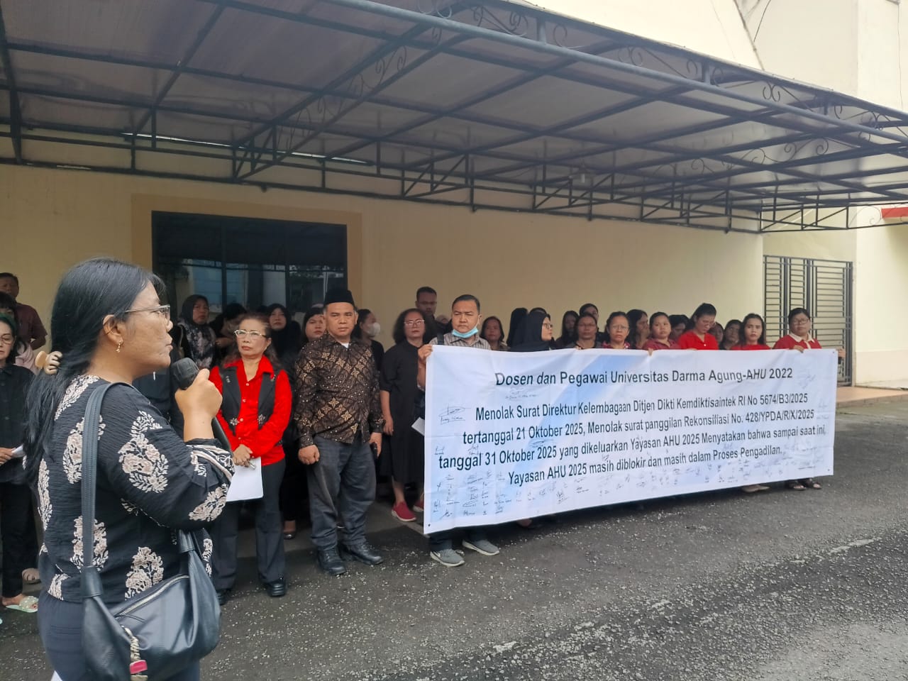 Aksi dimulai pukul 08.00 WIB setelah apel dan ibadah rutin yang biasa dilakukan civitas akademika kampus tersebut. Pantauan wartawan puluhan peserta aksi yang terdiri dari tenaga pendidik dan kependidikan UDA menyuarakan penolakan terhadap Surat Panggilan Rekonsiliasi No. 428/YPDA/R/X/2025 yang diduga dikeluarkan pihak Yayasan Perguruan Darma Agung (YPDA) versi HNK pada 31 Oktober 2025.