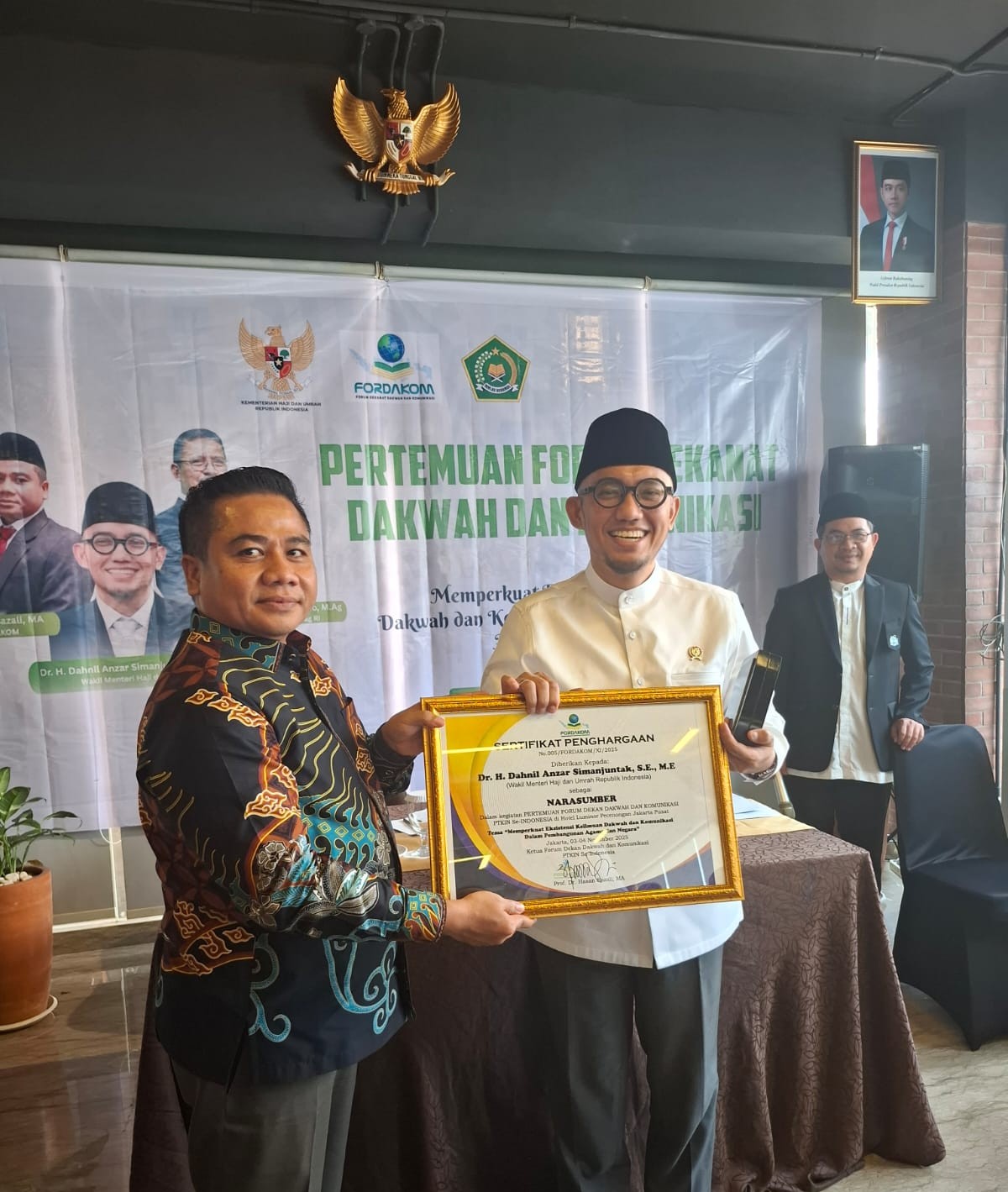Teks Foto : Ketua Umum Fordakom Prof Dr Hasan Sazali MAg, menyerahkan sertifikat pernghargaan sebagai nara sumber kepeda Wakil Menteri Haji Dan Umroh Dr Dahnil Anzar Simanjuntak SE, ME pada ada Pertemuan Fordakom di Jakarta, Senin (03/11/2025).
