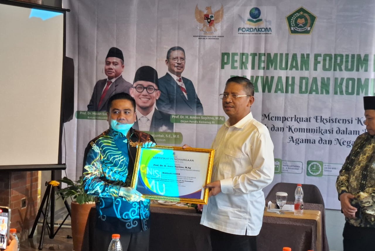 Teks Foto : Ketua Umum Fordakom Prof Dr Hasan Sazali MAg menyerahkan sertifikasi sebagai narasumber kepada Dirjen Pendis Kemenag RI Prof Amin Suyitno MA dalam kegiatan pertemuan Fordakom di Jakarta, Senin (03/11/2025).