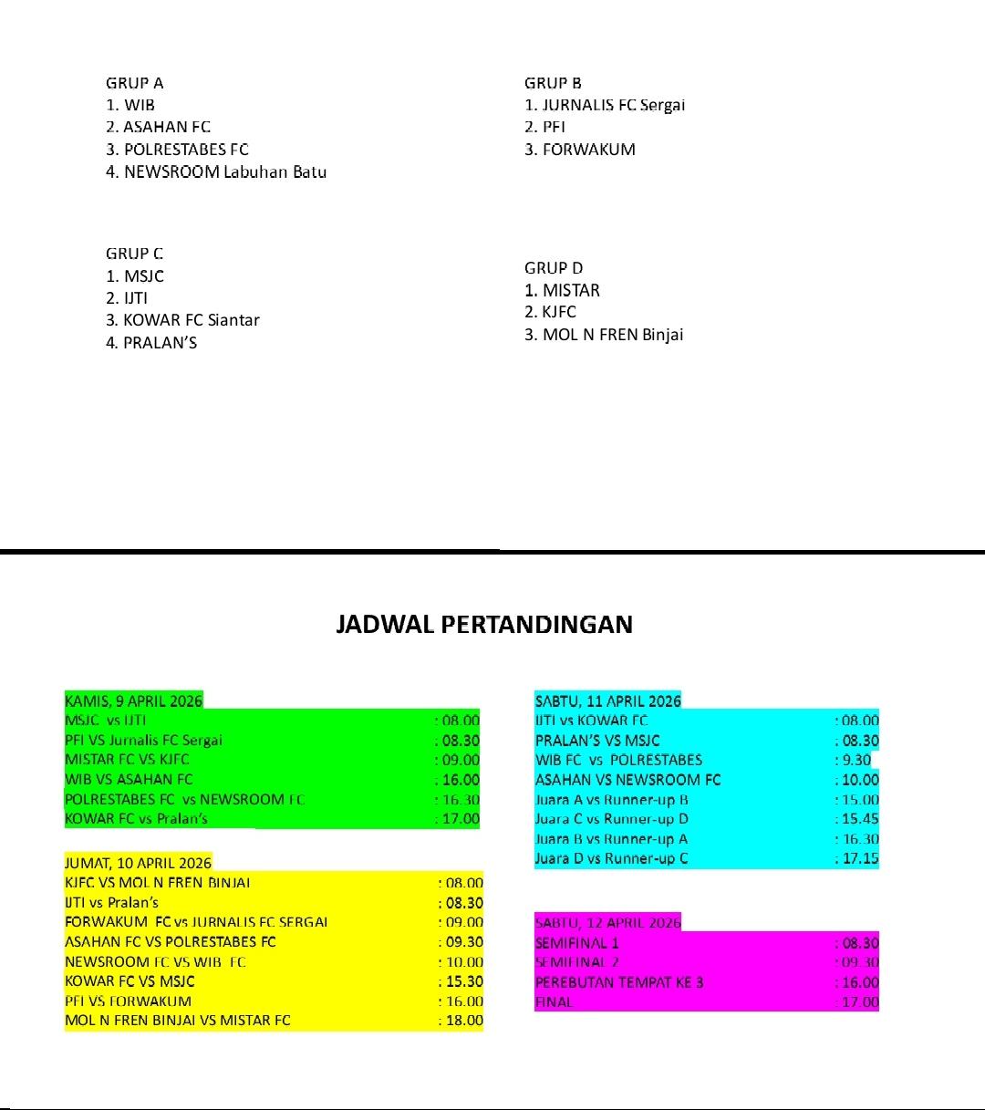 “Pada fase penyisihan, Forwakum FC dijadwalkan menjalani dua pertandingan pada Jumat (10/4/2026), masing-masing menghadapi Jurnalis Serdang Bedagai FC pada pagi hari dan PFI pada sore hari,” ujar Aris.