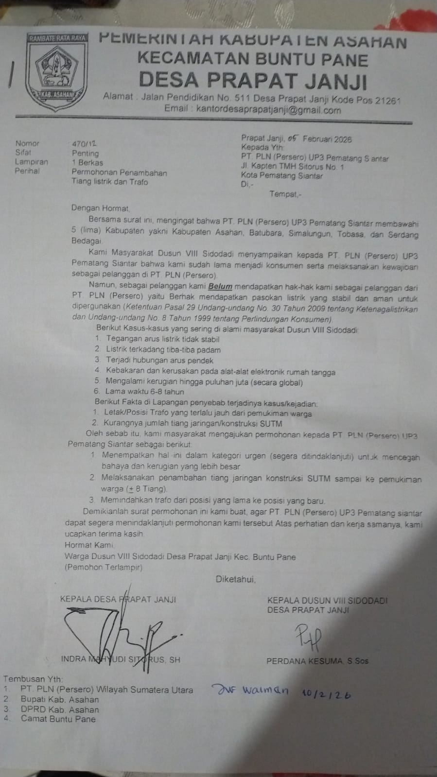 Surat tertanggal 5 Februari 2026 tersebut ditandatangani oleh Kepala Desa Prapat Janji, Indra Wahyudi Sitorus, bersama Kepala Dusun VIII Sidodadi, Perdana Kesuma. Surat ini menjadi bentuk keputusasaan sekaligus tuntutan warga atas hak layanan listrik yang layak.