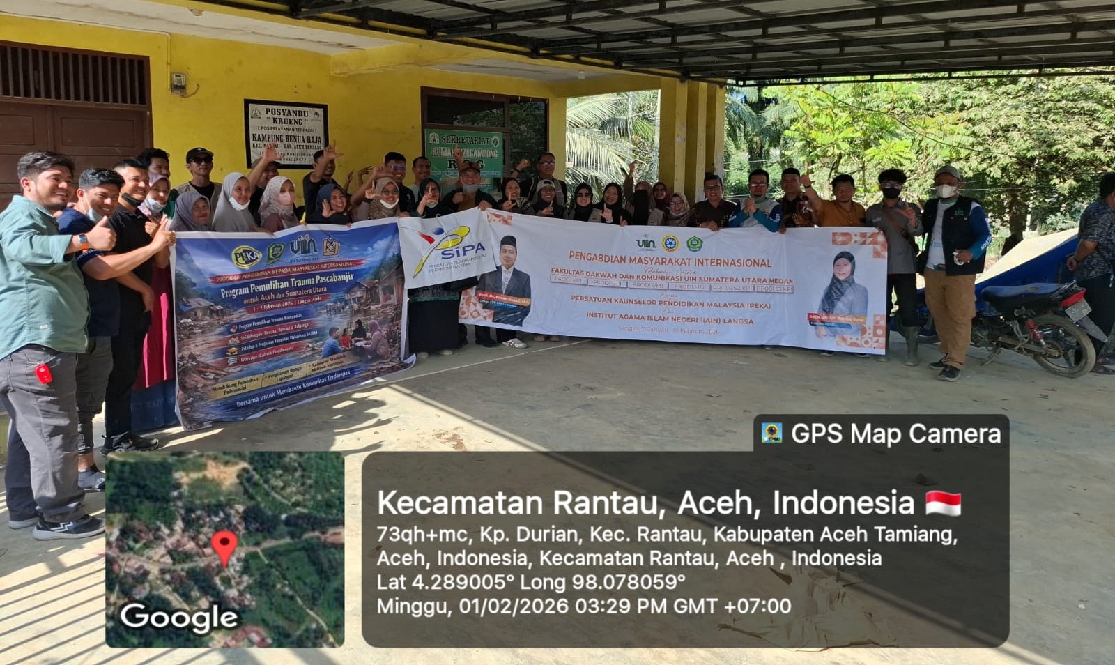 MEDAN – Fakultas Dakwah dan Komunikasi (FDK) UIN Sumatera Utara Medan berkolaborasi dengan IAIN Langsa dan Persatuan Kaunselor Pendidikan Malaysia (PEKA) melaksanakan Pengabdian kepada Masyarakat (PkM) Kolaborasi Internasional di Kabupaten Langkat dan Desa Banua Raja, Aceh Tamiang, Sabtu  (31/1/2026)  dan Minggu (1/2/2026).