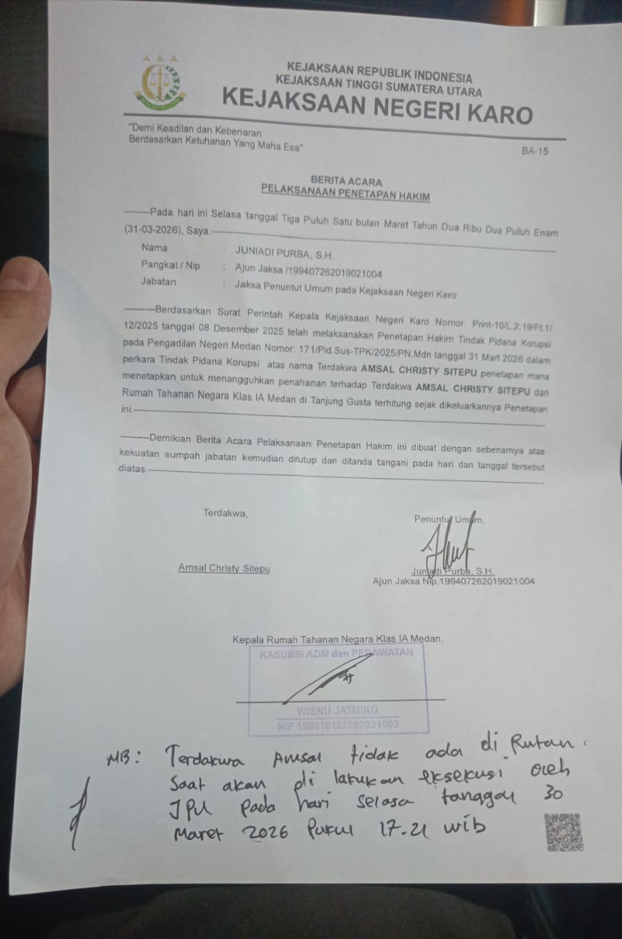 Medan — Rumah Tahanan Negara (Rutan) Kelas I Medan dilaporkan telah mengeluarkan terdakwa kasus korupsi, Amsal Christy Sitepu, tanpa kehadiran Jaksa Eksekutor dari Kejaksaan Negeri (Kejari) Karo, Sumatera Utara.