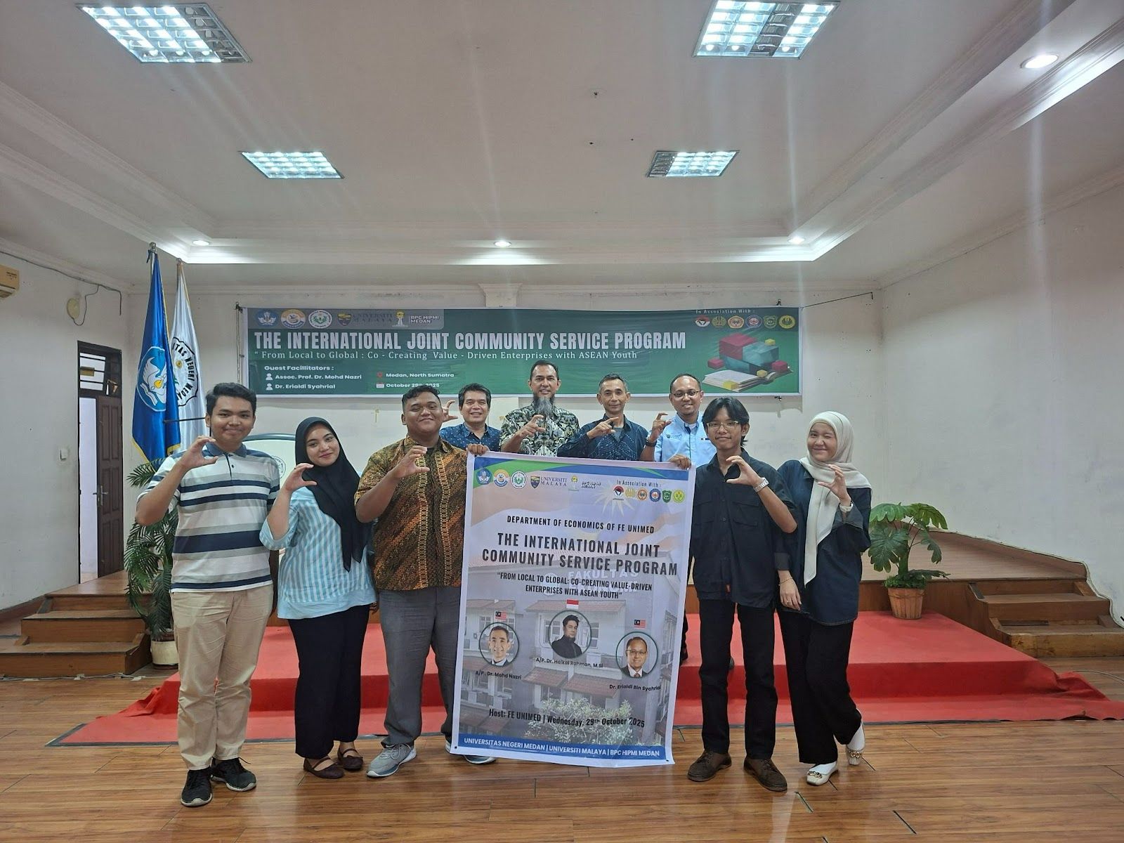 MEDAN — Fakultas Ekonomi Universitas Negeri Medan (FE Unimed) bersama sejumlah institusi akademik dan organisasi pengusaha muda dari Indonesia dan Malaysia menyelenggarakan kegiatan Pengabdian Kepada Masyarakat (PKM) Internasional bertajuk “From Local to Global: Co-Creating Value-Driven Enterprises with ASEAN Youth” pada Rabu, 29 Oktober 2025, di Aula Fakultas Ekonomi Unimed.