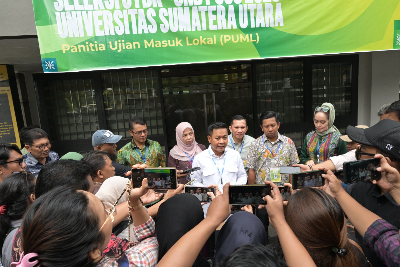 Rektor USU, Prof. Dr. Muryanto Amin, S.Sos, M.Si memberikan penjelasan kepada wartawan seusai melakukan peninjauan UTBK-SNBT 2026, di Kampus USU, Selasa (21/4/2026).