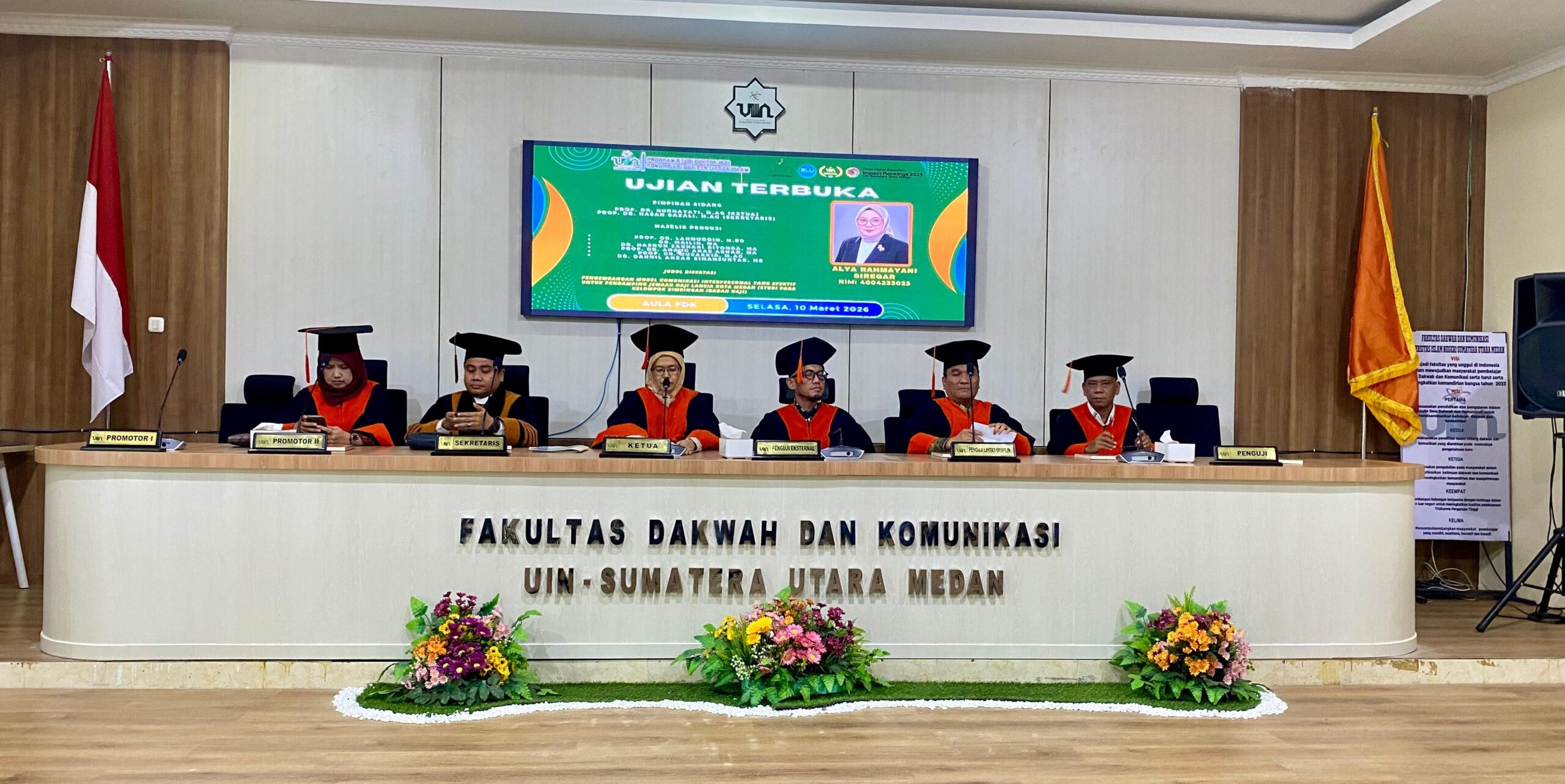 Sidang Promosi Terbuka S3 KPI FDK UIN Sumatera Utara, dipimpin Rektor UINSU Prof Dr Nurhayati sebagai Ketua Sidang, Sekretaris Sidang Prof Dr Hasan Sazali MAg, penguji interdisplin Prof Dr Muzakkir MAg, dan penguji internal Prof Dr Anang Anas Azhar MA, Dr Hasnun Jauhari Ritonga MA. Hadir juga dalam sidang tersebut Promotor Prof Dr Lahmuddin Ritonga, M.Ed dan Co Promotor Dr Mailin MA.